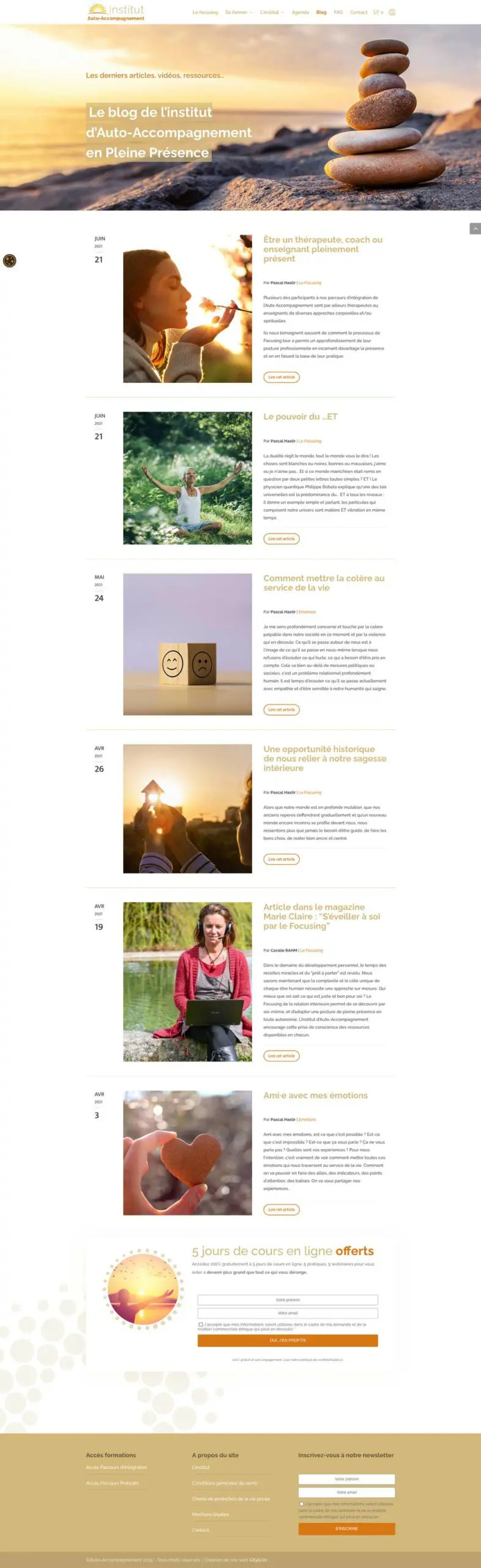 Nous avons ainsi imaginé un logo aux couleurs chaudes, inspirant le soleil levant, source de vie, et le rassemblement de personnes représentées chacune par un cercle plein. Ce motif a ensuite été décliné dans l’ensemble du site web pour créer une ligne graphique entre chaque page. Par ailleurs, chacune des formations de l’Institut possède sa propre identité graphique et peut être reconnue facilement.